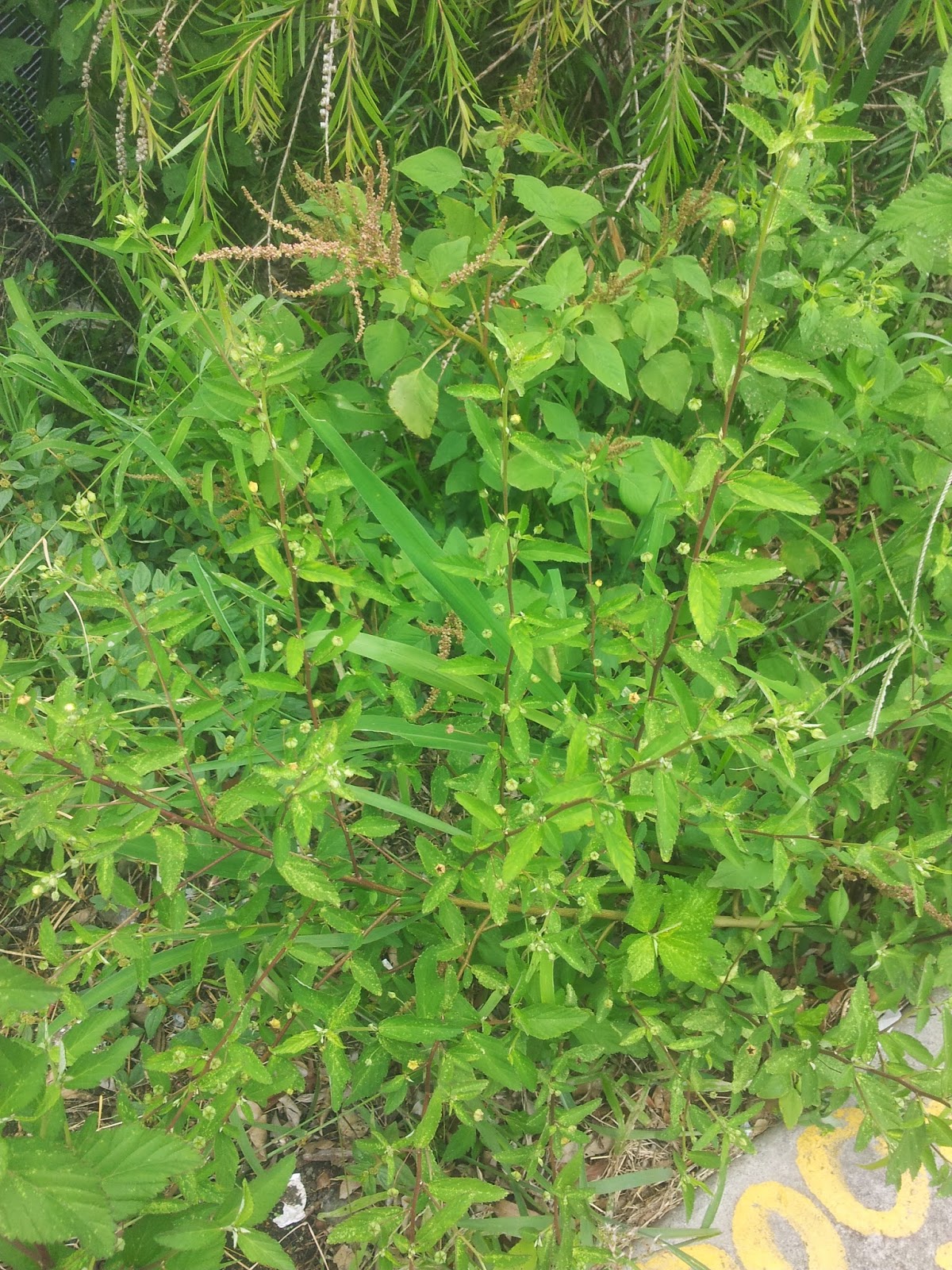 Sida Rhombifolia - (Queensland Hemp) - Join the campaign to keep this a native, it is being classified as a weed because of the secret properties I am gonna tell u about. The pounded leaves are used to relieve swelling, the fruits are used to relieve headache, the mucilage is used as an emollient, and the root is used to treat rheumatism (Parrotta 2001). Australian Aborigines use the herb to treat diarrhea. Leaves are smoked in Mexico and a tea is prepared in India for the stimulation it provides. It is really easy to identify coz of its straggly appearance. After the first 6 months the leaves start getting smaller and sparser. Leaves are shaped like arrows and the yellow flower is an easy identifier. The stalks grow up from low on ground. Its shrubby doesnt grow much more than 1.5m but is about 1m wide. We have a lot growing in our yard and there's a few on the Beenleigh line. We have one drying in our house, if you come visit, ask us to make a tea "-)