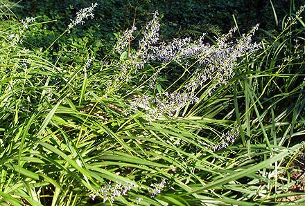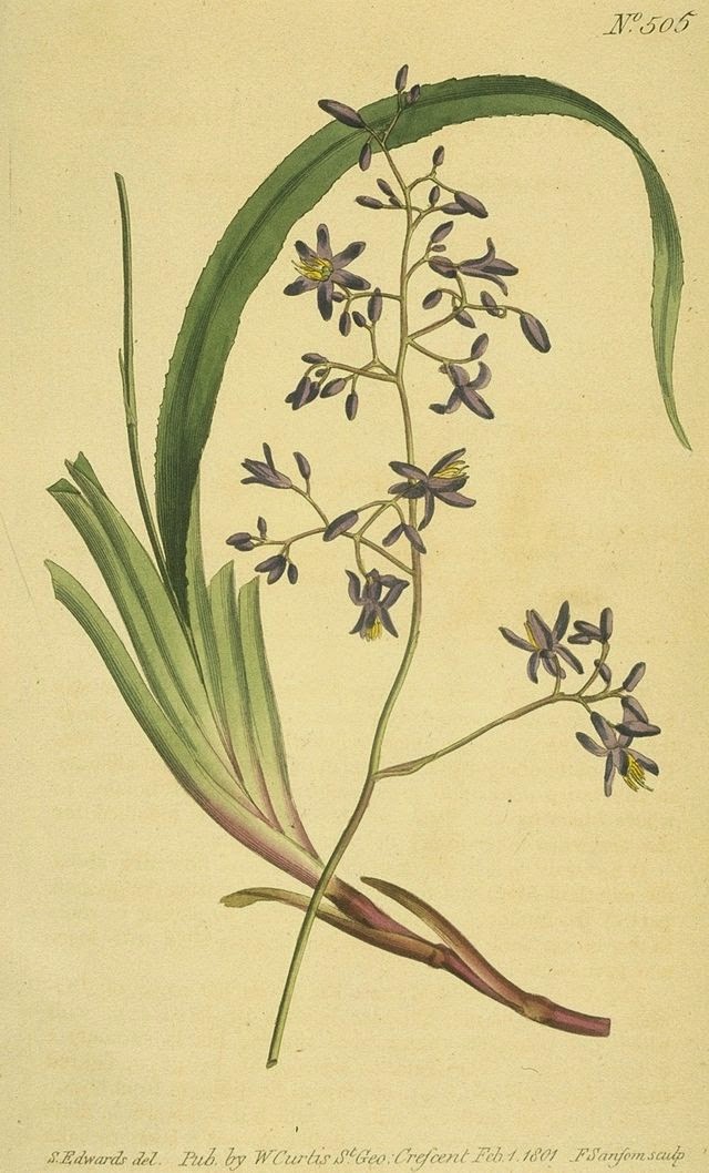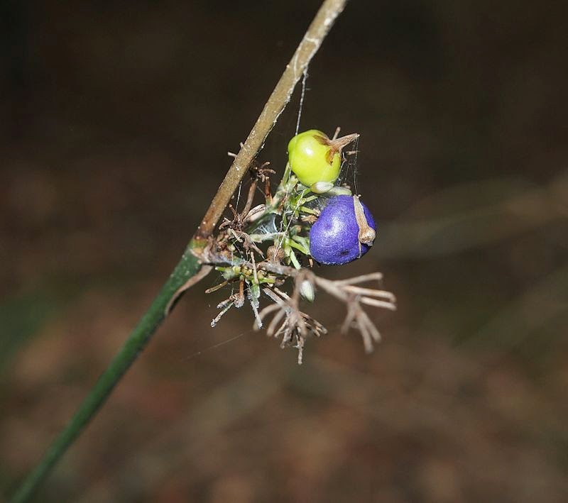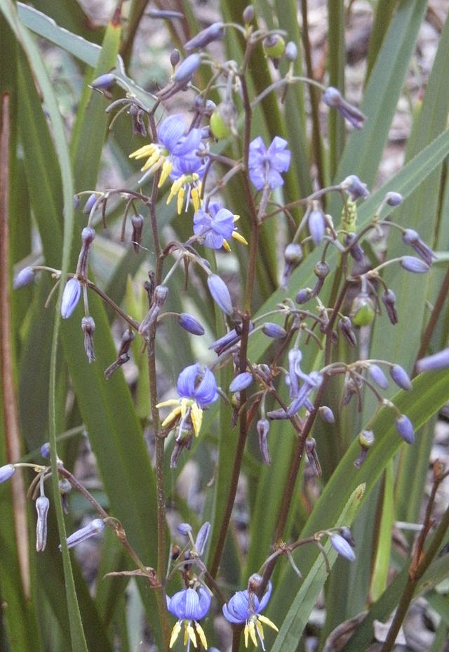 romantic grass of the week: dianella caerulla (blue flax-lilly) this isnt actually a grass but looks like one when its not fruiting and flowering. the leaves are blade like 75cm long 5m wide straight or toothed.. 1/3 in sheath. sheath folds back on itself. perennial herb, tufted and solitary or matt forming.. fibrous big rhizome root. blue star shaped flowers exceed foliage making the plant up to 1m high 3-25 flowered. can tolerate damp but prefers dry. purple berries are ed