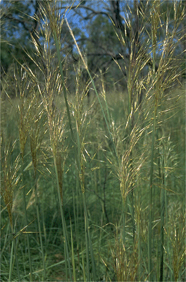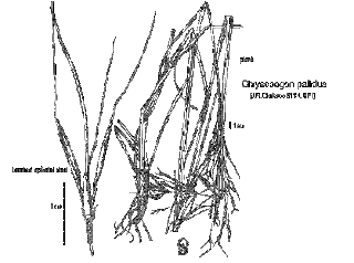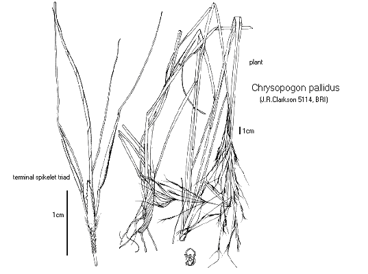 romantic grass of the week: Chrysopogon pallidus (false beard grass, ribbon grass) a type of vetiver grass native to north australia, grows in sandy soil 100-150cm, dense, tufted, 3-5noded, leaf blades 20-40cm long, hairy, scabrous or round projections on them, folded in or rolled in on itself. a panicle of rames 18-30cm long 3cm wide (1 cluster spikelet attached to base, 2 cluster companion spikelet on small stalk, awned)