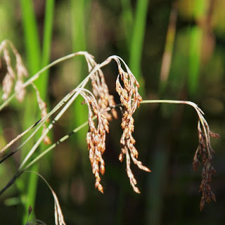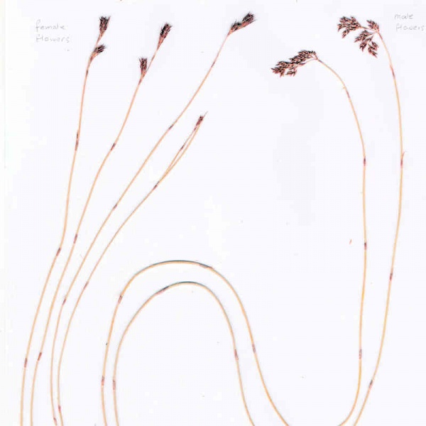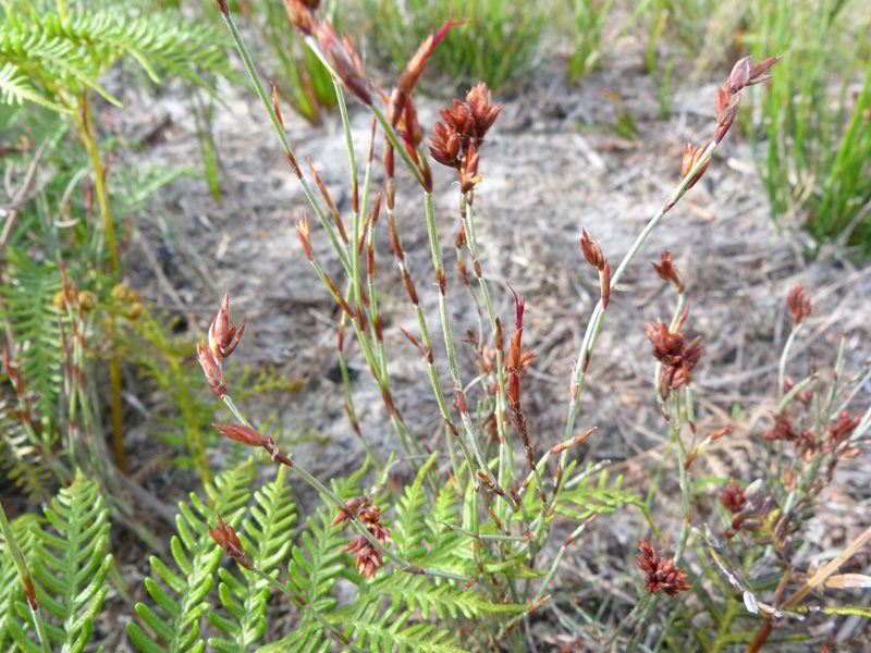 Leptocarpus tenax - (slender twine rush) smooth greyish green stems 60-100cm tall; leaves reduced to scaly, dark brown leaf sheaths with membranous tip weathering to aristate point. Male flowers in numerous narrow stalked purplish brown spikelets 4mm long in drooping panicles. female spikelets reddish brown less than 10mm long, nearly sesile, few, in erect inflorescences. Nut narrow-ellipsoid 2-3mm long. damp sandy soils in heath sedgeland and low woodland mainly coast in all states of australia. genus entirely endemic to Australia