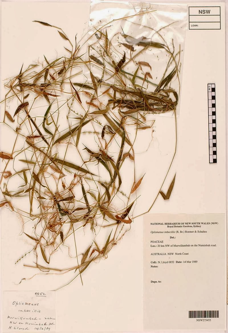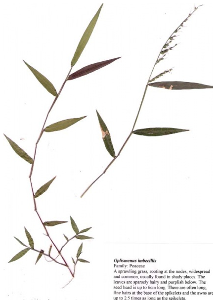 romantic grass of the week - on a valentine's bushwalk? a perfect place for lovers - a mat of carpeting pademelon grass oplismenus imbecillus. a sprawling grass rooting at nodes, widespread and common usually in shady places. leaves sparsely hairly, purplish below to 8cm x 10mm flowering spikes to 6cm from the same family as the creeping beard grass (oct 3, 2013), different shape leaf and underside colour.