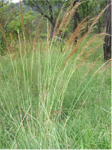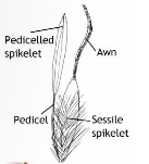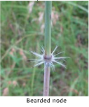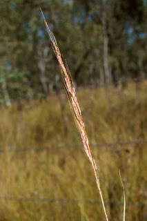 one of the three native wheats. a tufted perennial. compound inflorescence - a panicle of rames 12.5-45cm long, 2.5cm wide. red brown when mature. spikelets are companioned a sessile and a pedicilled one.. the sessile one has a long awn attached. distinctive bearded node. leaves have a white midrib from shiny green blades to blue green sands. found on red earth, loams, watercourses, swamps, valleys. north coast Qld, NT, WA. prevalent in townsville (thanks to JCU)