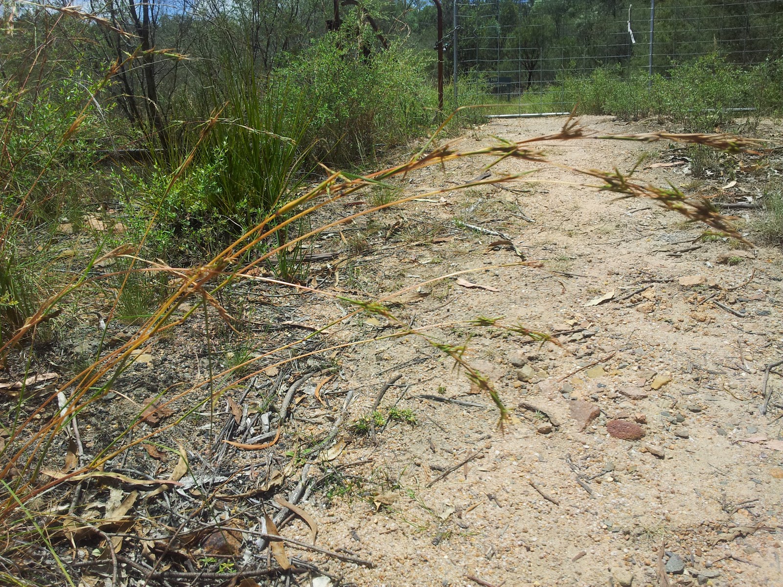 romantic grass of the week: barbed wire grass (cymbopogon refractus) widespread in coastal eastern Australia in poor soil but also found in NT. has a red/green seed heads which looks like barbed wire, 30-150cm tall, erect, mid-culm nodes glabrous. smells like ginger when crushed, (in lemongrass family).. these specimens found south of tenterfield near an abandoned railtrack